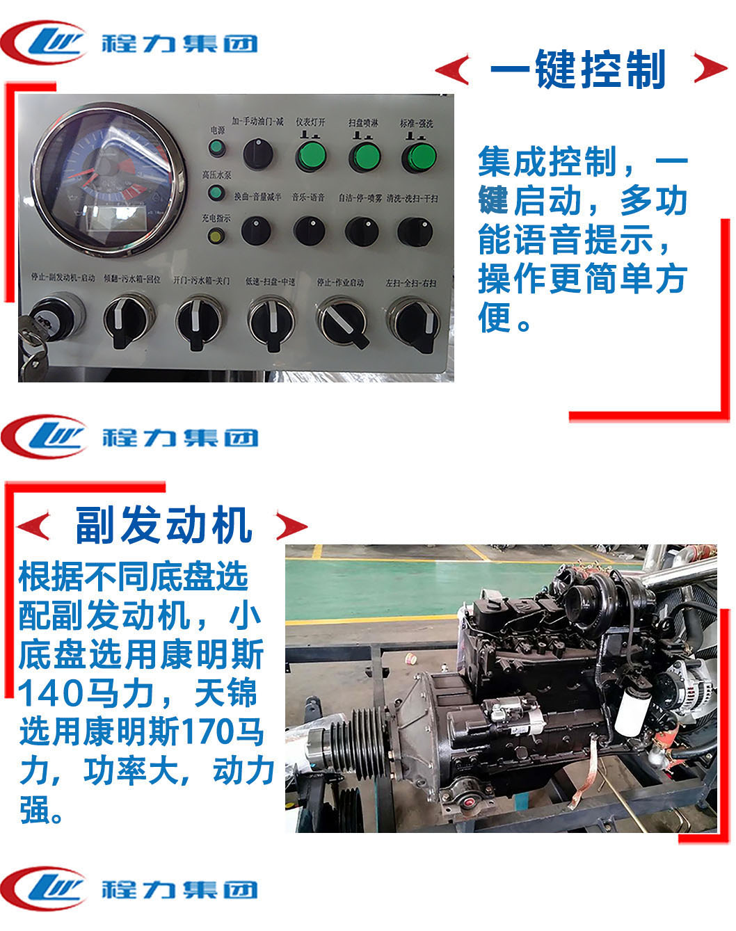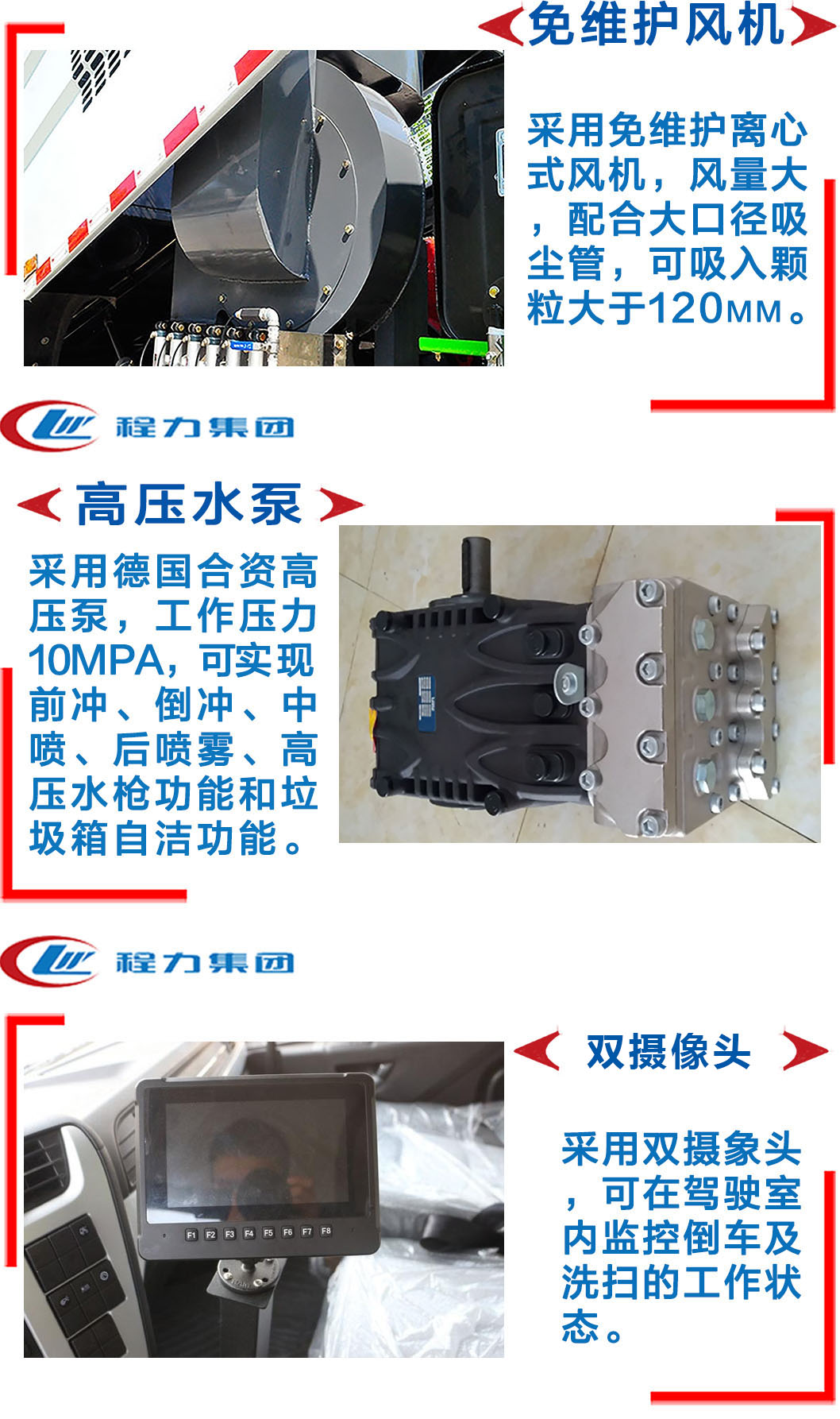 上裝配置:副發動機采用康明斯170馬力,自動離合器驅動風機和高壓水泵,有效減少風機啟動和停止時對發動機的沖擊,低噪音,低油耗量和節省成本等優點。采用洛陽北玻品牌,大功率耐磨免維護離心風機,無嗓音,效率高風量大,使用壽命長。高壓水泵采用合資國際知名德國品孚,T7012IR型柱塞柱,壓力高,最高壓力可達到16MPa。清水箱充分利用車載空間,容積達到9個方,內置水位報警器。垃圾箱采用雙層內膽不銹鋼結構,內部加裝過濾網板,有效地防止樹葉,塑料袋之類的輕飄物堵塞風口及灰塵排出,內置污水報警系統,可通過后門處污水閥方便的將污水排出下水道,最大限度的利用了垃圾箱裝載垃圾的空間,廂體采用傾翻卸料,帶高壓沖洗自潔裝置。