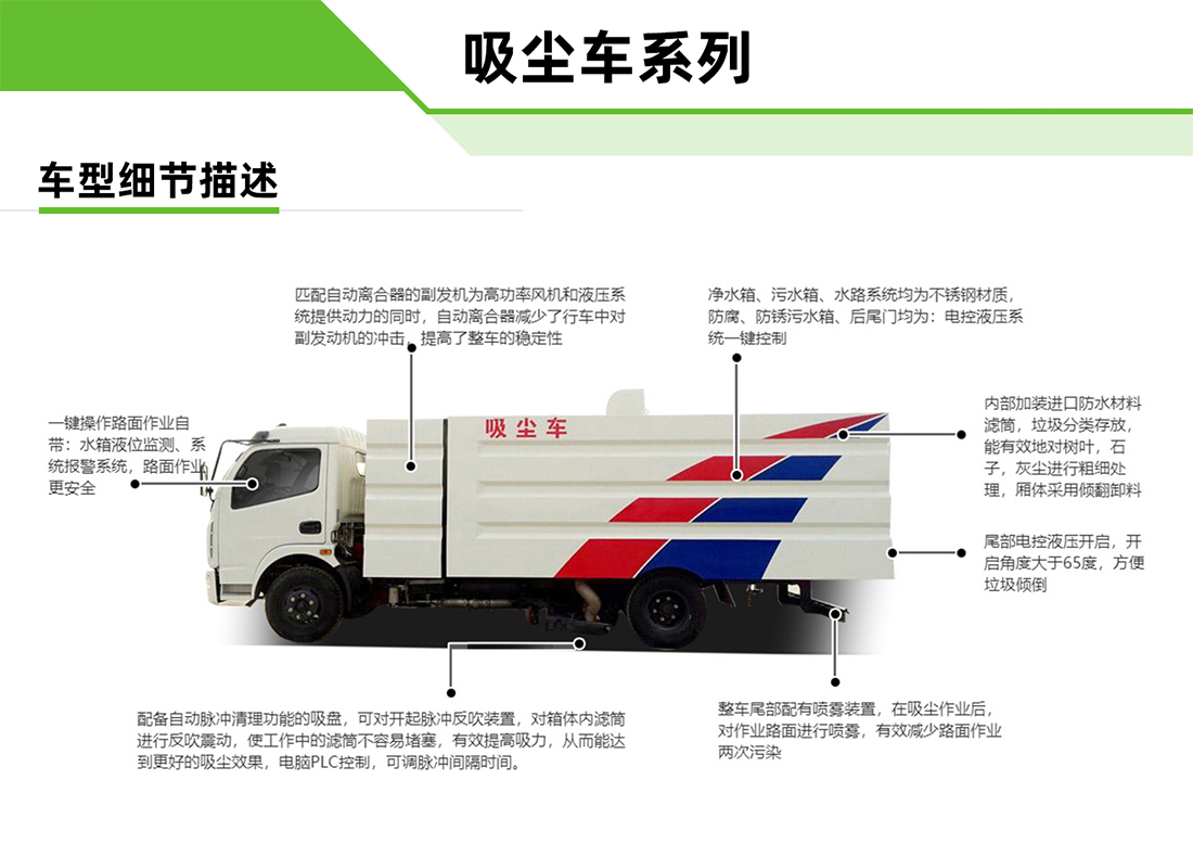 東風(fēng)小多利卡5方吸塵車專用配置:塵箱:4立方米,水箱:1立方米;中置吸盤、江鈴五十鈴副發(fā)動(dòng)機(jī)、施耐德控制開關(guān)、海普瑞斯電磁閥組、無級(jí)變速自動(dòng)離合器、免維護(hù)離心式風(fēng)機(jī)、高精度垃圾箱過濾系統(tǒng)(最高可達(dá)0.5微米),不銹鋼垃圾箱、進(jìn)口脈沖閥、垃圾箱舉升自卸、尾部LED箭頭燈、車尾霧狀噴水潤(rùn)濕功能、倒車影像、手動(dòng)泵應(yīng)急系統(tǒng)。