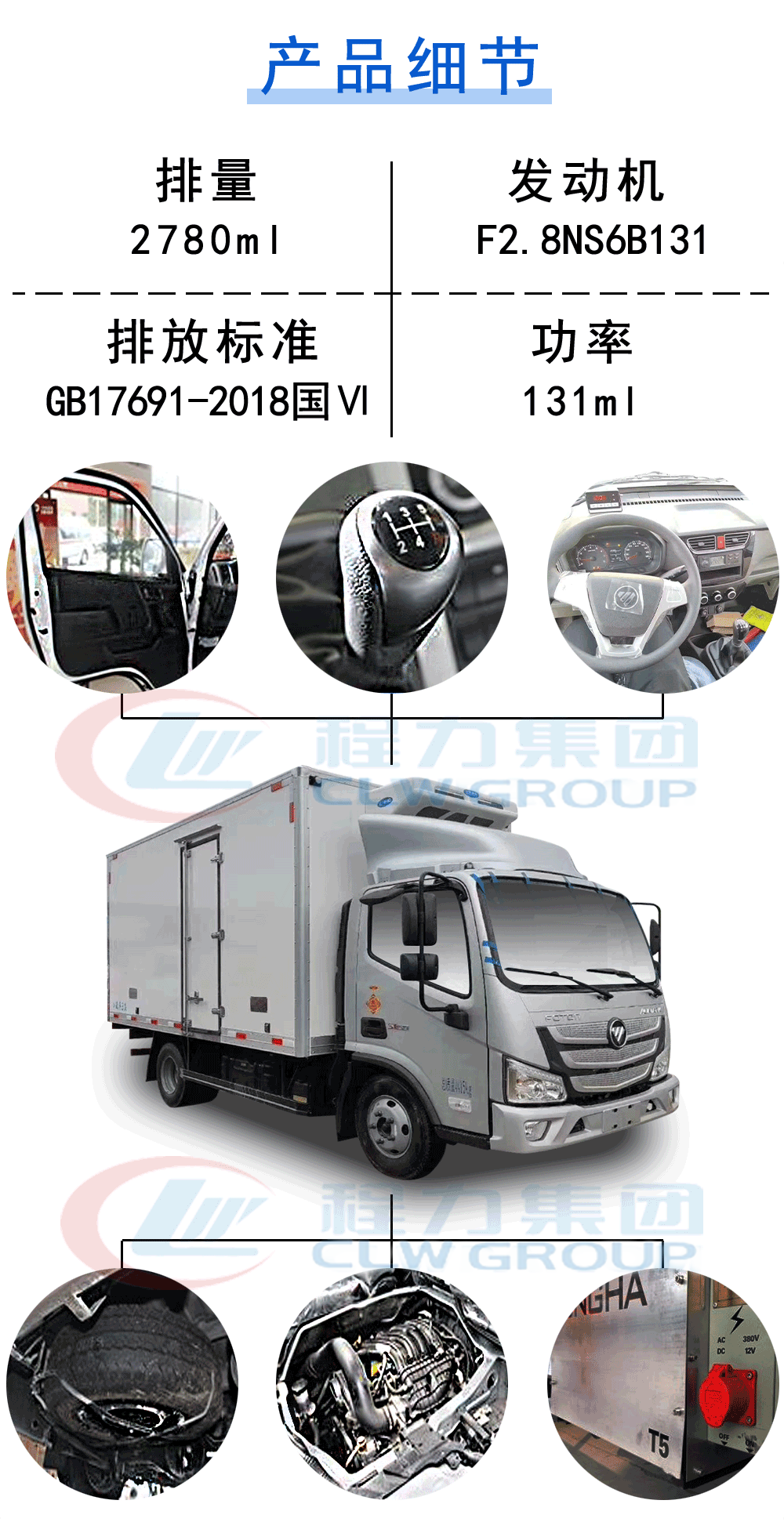 整車尺寸:5995*2340*3220 箱體尺寸:4080*2100*2100 功率/馬力:96KW/131馬力2780排量 福田康明斯發動機(F2.8NS6B131) 7.00R16LT輪胎