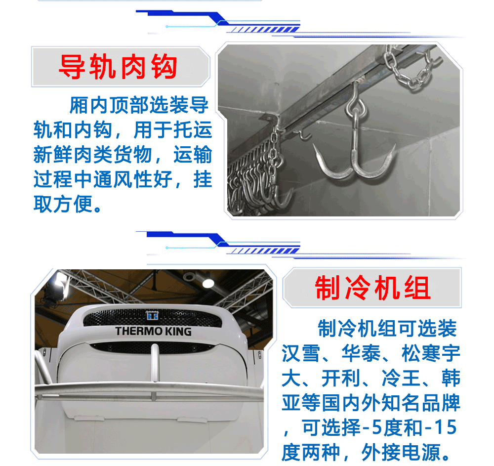 選裝冷機(jī):可根據(jù)客戶的用車需求選擇不同的機(jī)組,客戶可選-5°C、-10°C、 -15°C、-18至20°C冷藏機(jī)組, 冷藏機(jī)組品牌有國(guó)產(chǎn)勁達(dá)K牌、韓亞、漢雪、華泰、松寒、凱雪等冷藏機(jī)組,進(jìn)口冷藏機(jī)組品牌有:美國(guó)開利、美國(guó)冷王.冷藏機(jī)組分為獨(dú)立機(jī)組和分體機(jī)組!