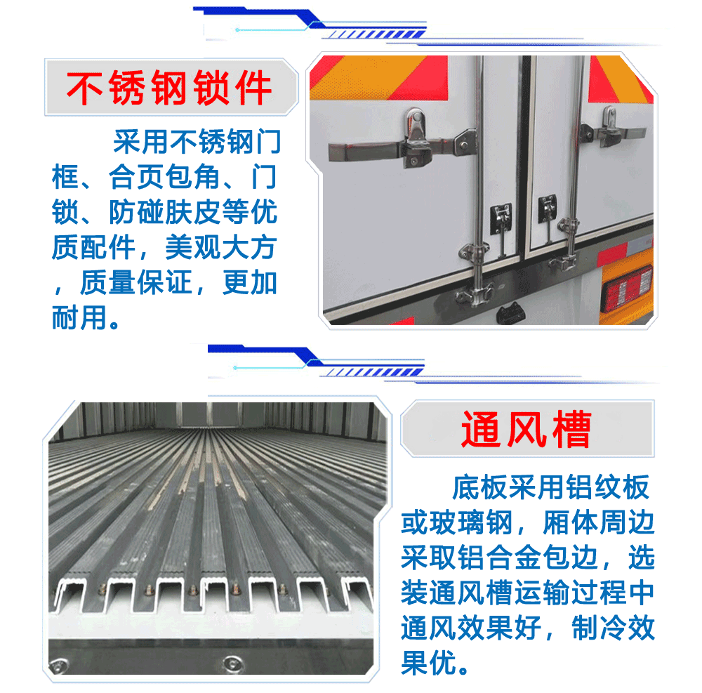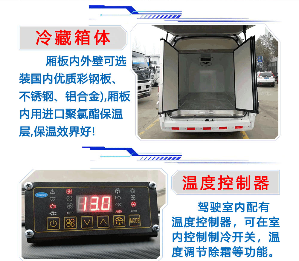 廂體配置:廂體板采用市面上最先進技術-負壓加熱抽真空技術,保溫性能達到國家A級標準廂體。內部尺寸為: 容積為 立方,廂體內外面料采用最新款納米玻璃鋼(不吸光、隔熱性好、硬度強、抗氧化)廂體厚度為8.5cm ,內襯骨架為防銹處理優質輕鋼型材鍍鋅管,保溫材料為無空隙填充聚氨酯發泡,廂體底部為鋁合金花紋板或選平面納米玻璃鋼,廂體采用鍍鋅不銹鋼包角,加厚型鋁合金包邊,后門框為不銹鋼,加厚型不銹鋼后門]合頁及鎖件,全車所有不銹鋼部位均使用食品級304不銹鋼制造,廂體內部采用ED照明燈及廂體示寬燈。